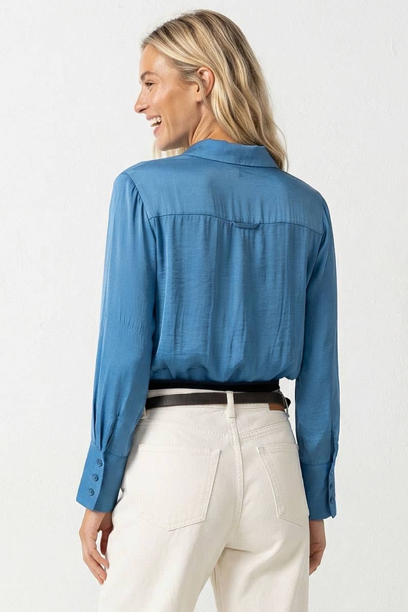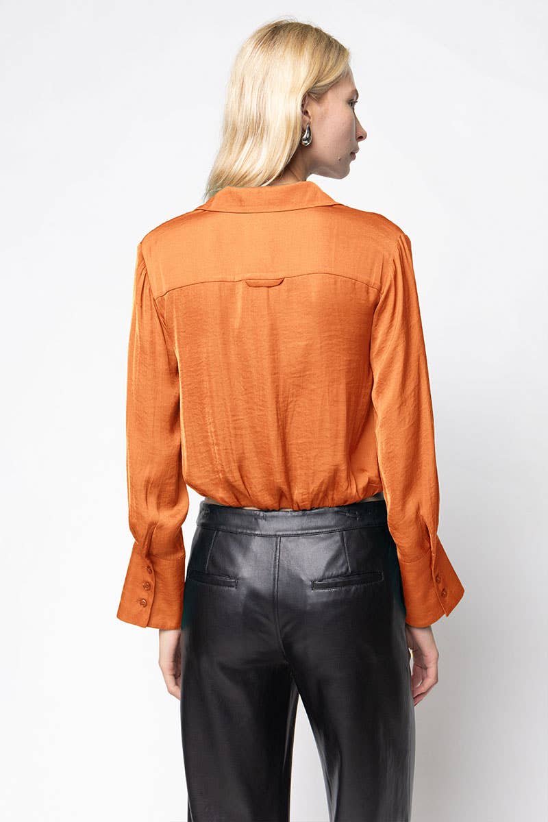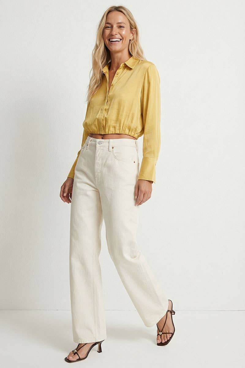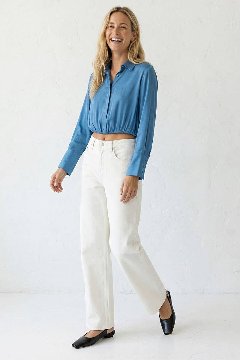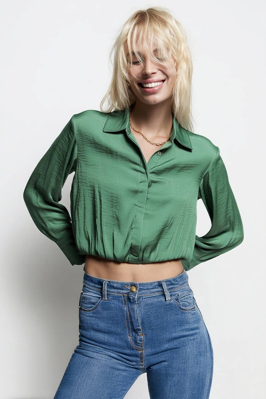 The Cropped Button-Down Blouse with Elastic Hem combines contemporary style with playful details. Featuring a classic button-down design and a flattering cropped length, this blouse is finished with an elastic hem for a comfortable and stylish fit. Ideal for both casual and dressy occasions, it adds a chic and modern touch to any outfit.