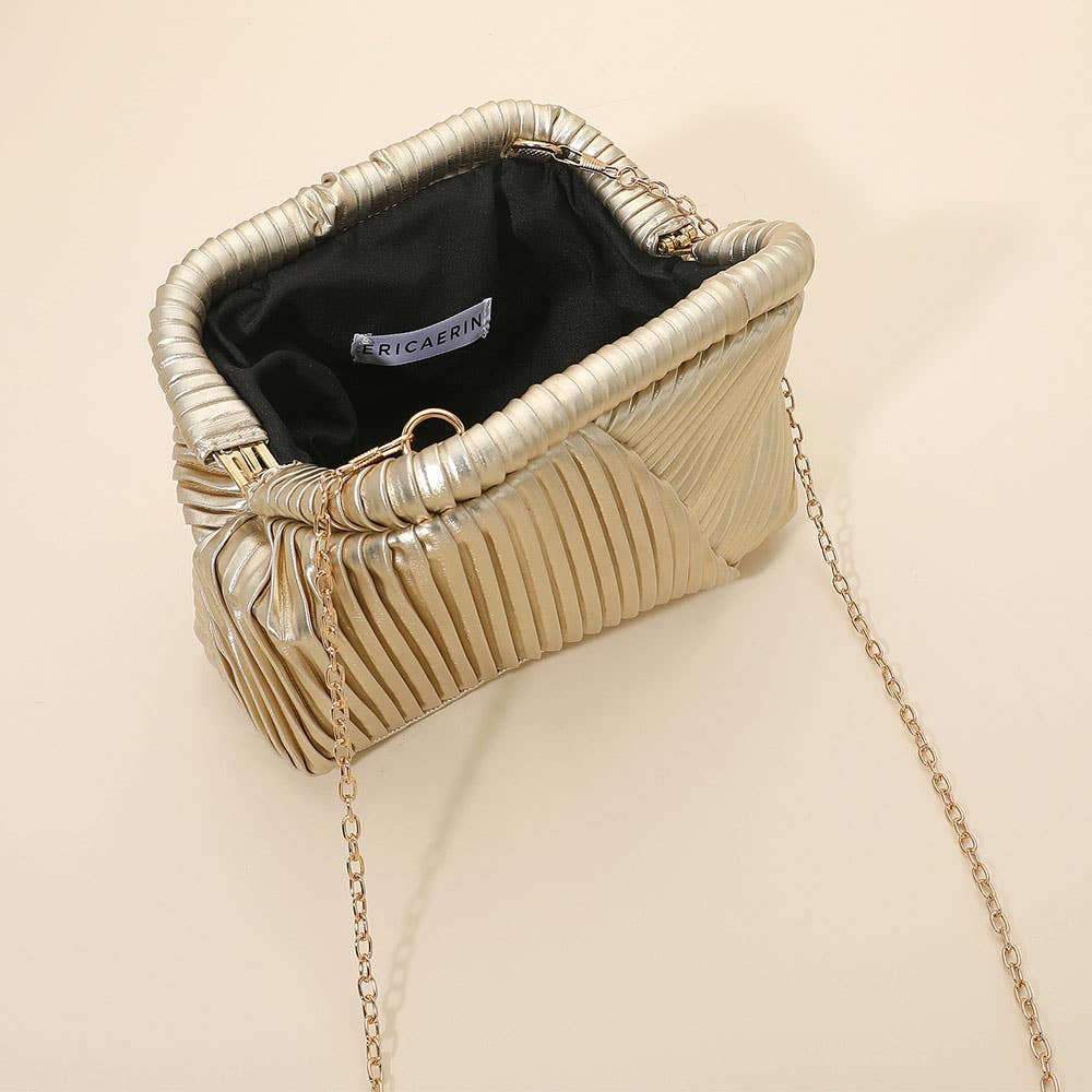This refined evening clutch showcases a sculpted, pleated exterior with a soft, structured silhouette that adds dimension and elegance. A detachable chain strap offers styling versatility, making it an ideal accessory for special events, nights out, or polished everyday looks.