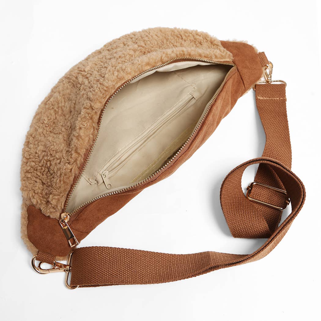 Faux Suede Sherpa Sling Bag Adjustable Strap - Fuzzy Sling Bag for Cold Weather - Mini Handbag with Zipper Closure - Divided Spaces for Phone and Wallet - 100% Polyester Dimensions : H 15" x W 7 "