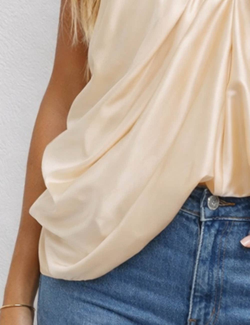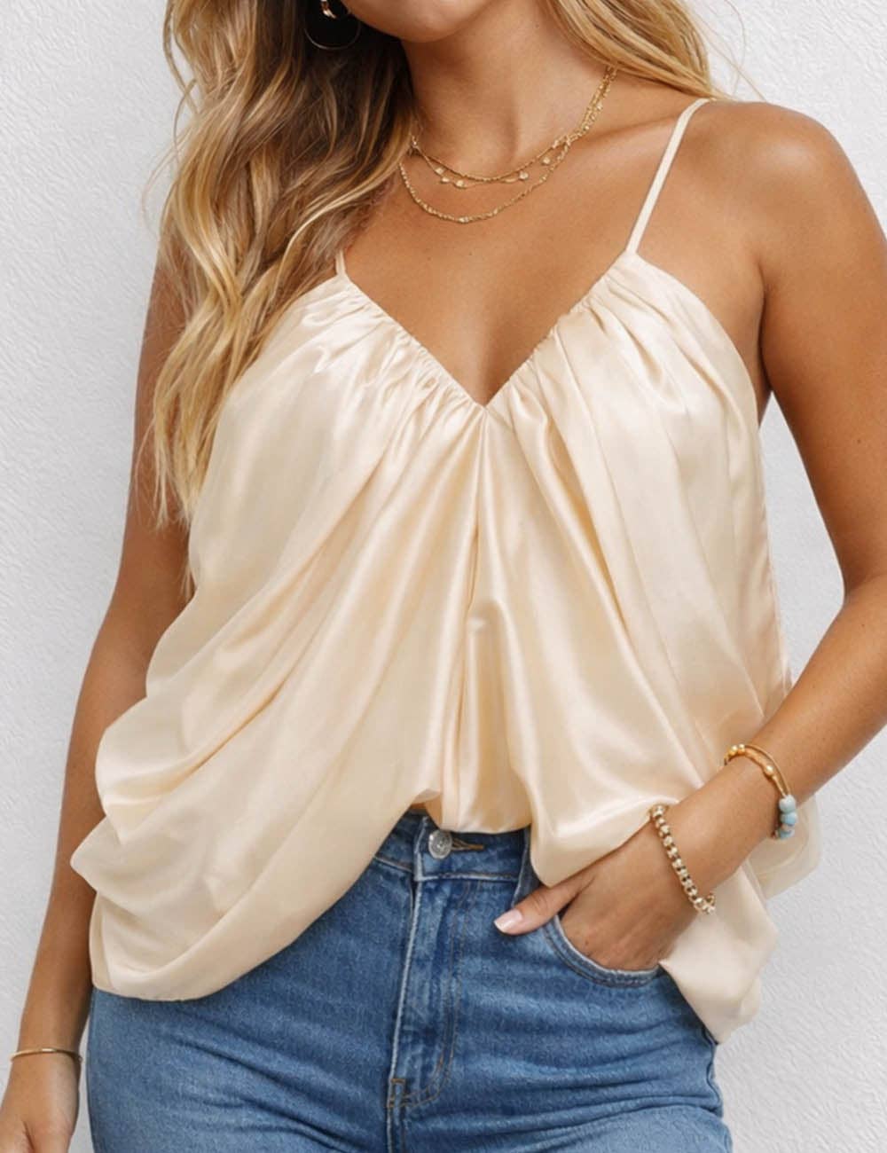 A sleek satin cami featuring a flattering V-neckline and soft ruched detailing for a feminine, fitted look. The cropped length pairs perfectly with high-waisted denim or skirts for an effortless day-to-night outfit. ✨