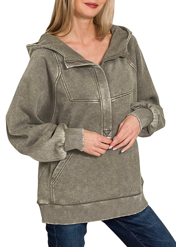 ACID WASH FLEECE OVERSIZED 1/4 ZIP KANGAROO POCKET HOODIE - 1/4 ZIP CLOSURE - KANGAROO POCKE