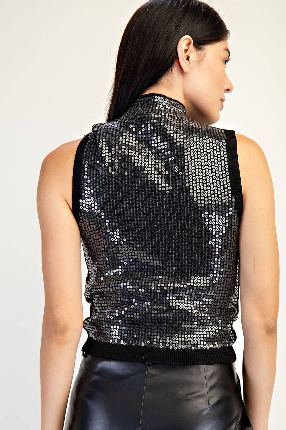 This high neck sleeveless top delivers effortless glamour with its all-over sequin knit design. Crafted on a stretch base, it offers both structure and comfort, allowing easy movement while maintaining a sleek, body-skimming fit. The mock neckline enhances the sophisticated silhouette, while the ribbed knit hem adds a clean, polished finish. Ideal for parties or evening events, this shimmering piece transitions seamlessly from statement top to elevated layering piece. - Fully sequined stretch knit for a glam finish - Mock neckline with sleeveless design - Ribbed knit hem for a tailored fit - Comfortable stretch construction