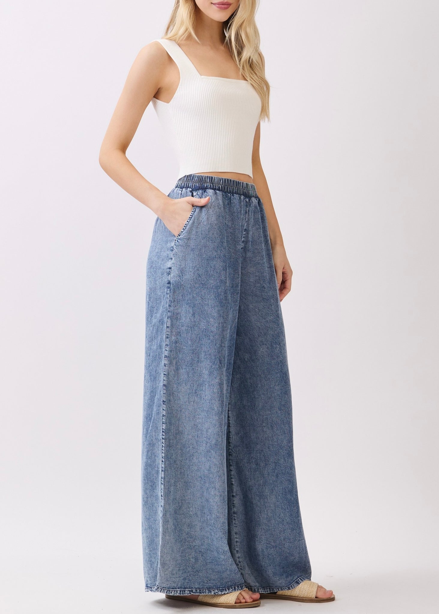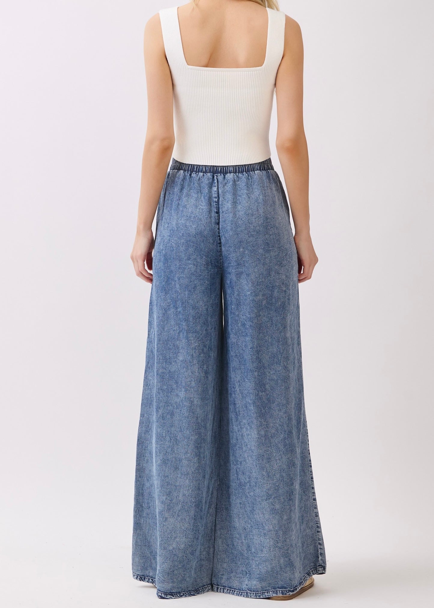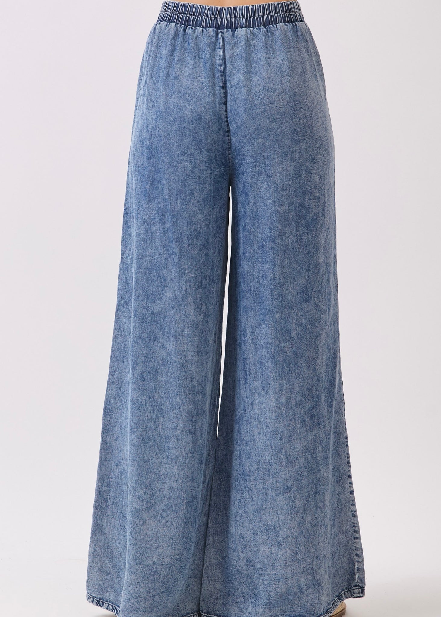 MINERAL WASH WAIST ELASTIC WIDE LEG TENCEL PANTS.