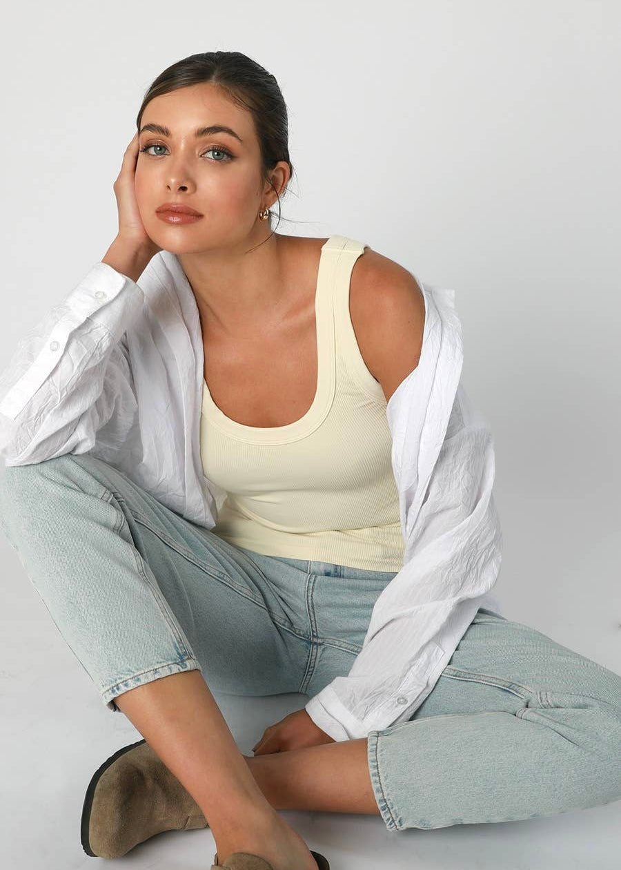 Size: One Size. A reversible ribbed knit tank top that can be worn as a scoop neck or turned around to be worn as a crew neck. Fabric: 92% Nylon / 8% Spandex. Made in USA Best Selling Tank Top A must to add to your essentials wardrobe.
