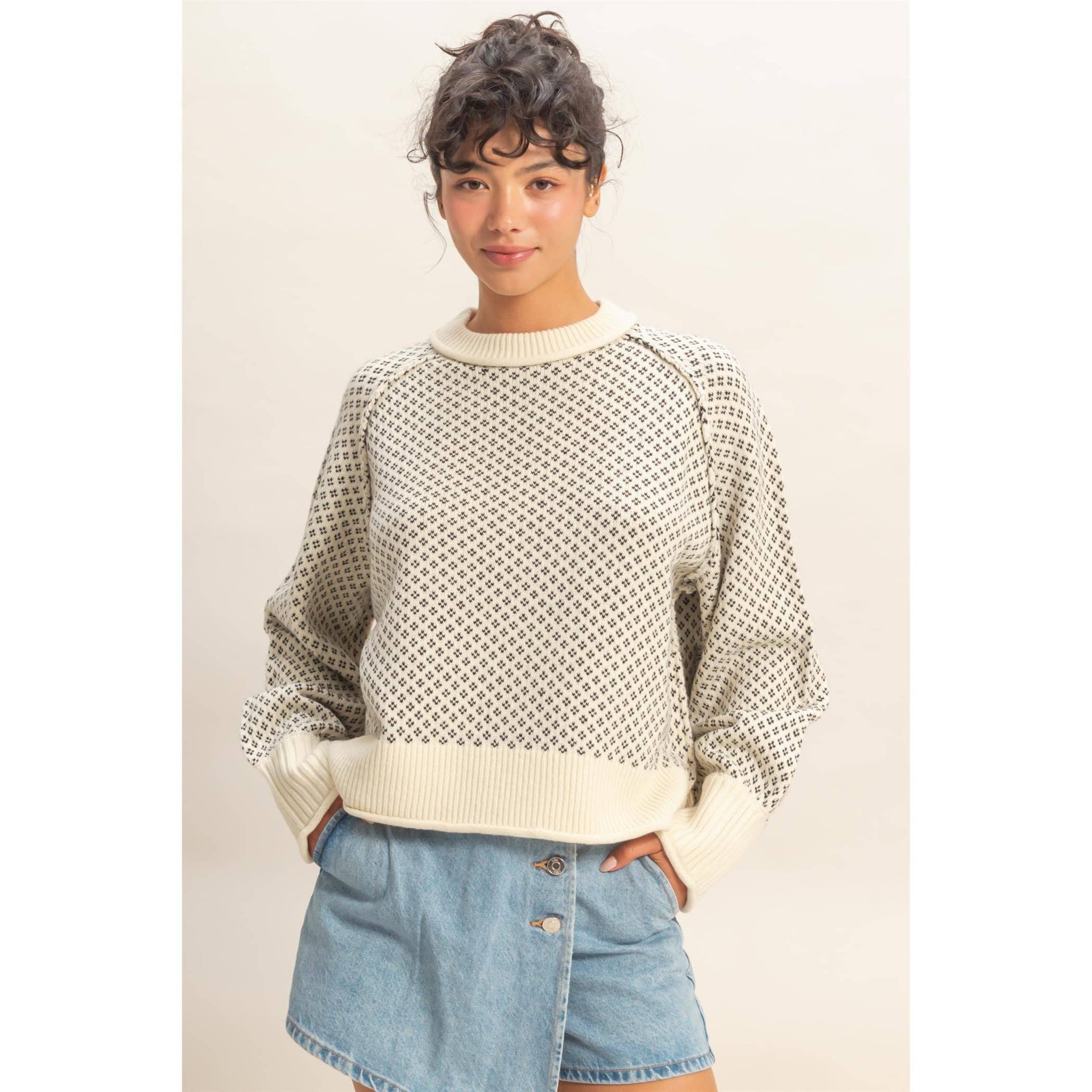 This comfortable sweater features a distinctive small geometric pattern and neatly mock neckline, offering both style and warmth. Ideal for casual outings or cozy indoor events, it provides versatility in your wardrobe. Pair with tailored pants or layer under a sleek jacket for a refined look. Model Is 5' 7" Tall, 32" Chest, 25" Waist, 36" Hips And Wearing A Size Small