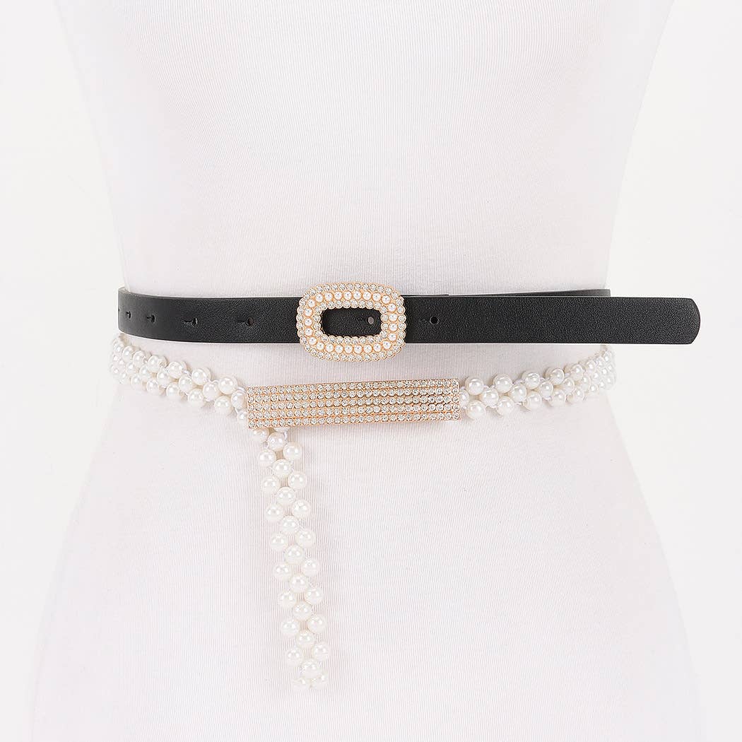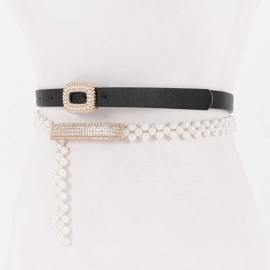 This Pearl & Rhinestone Layered Belt combines a sleek leather belt with a rhinestone - encrusted buckle and a pearl - adorned belt with a dangling pearl tassel. The mix of pearls and rhinestones creates an elegant, glamorous look.