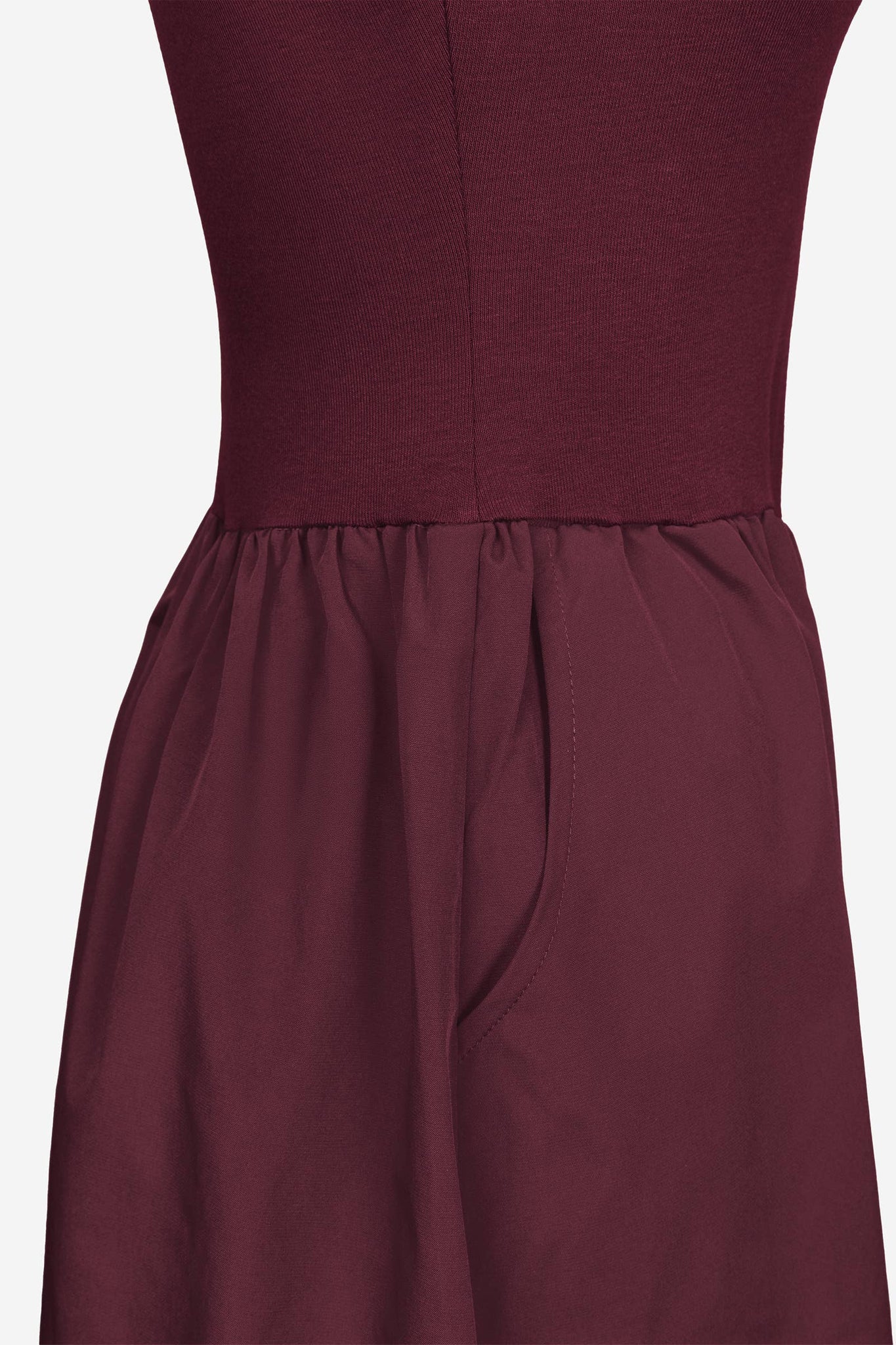 Women's Sleeveless Mock Neck Midi Dress Soft jersey knit bodice meets an elegant woven skirt for a refined silhouette Mock neck, sleeveless cut, and yes—pockets included Perfect for fall weddings, date nights, or any dressed-up evening event