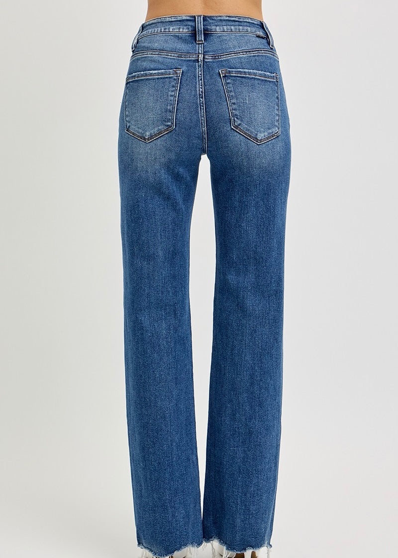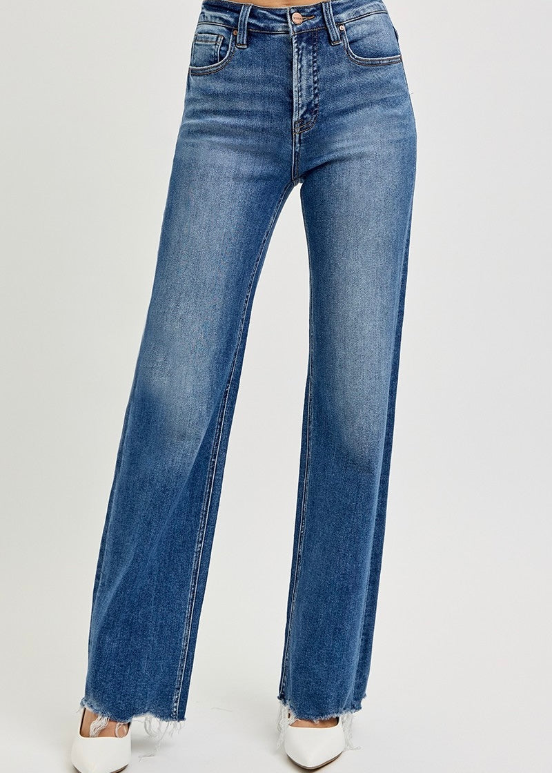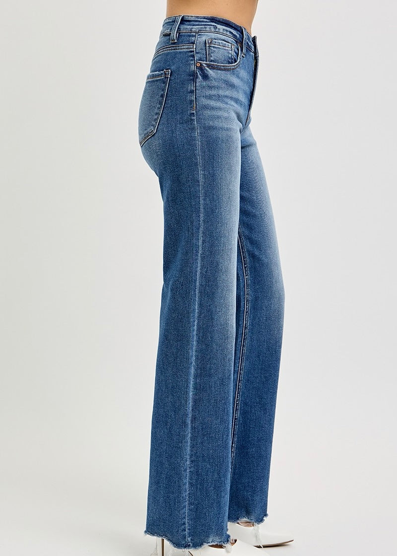 TUMMY CONTROL HIGH RISE WIDE LEG RAW CUT HEM JEANS - Rise 10 1/2" | Inseam 32" in size 3/26 - Model Info: Height 5'9" | Waist 24" | Hips 34" - Model is wearing size 1